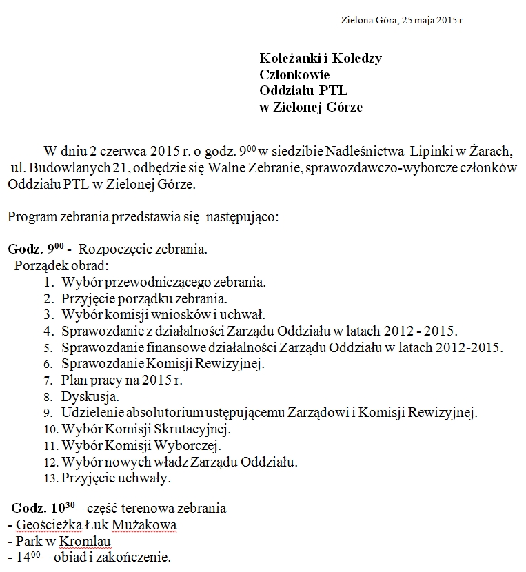 W dniu 2 czerwca 2015 r. o godz. 9:00 w siedzibie Nadleśnictwa Lipinki w Żarach, ul. Budowlanych 21 odbędzie się Walne Zebranie sprawozdawczo-wyborcze członków Oddziału PTL w Zielonej Górze.