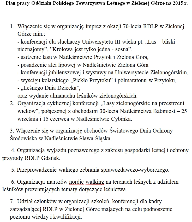 Plan pracy Oddziału Polskiego Towarzystwa Leśnego w Zielonej Górze na 2015 rok.